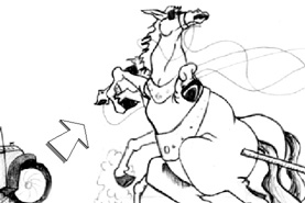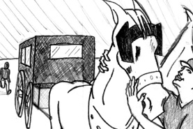 Caught off guard, he driver drops the reins and falls out of the carriage... |